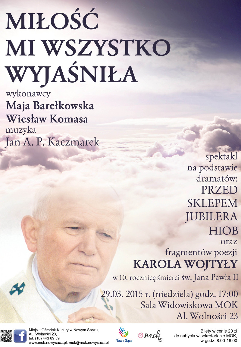 W niedzielę 29 marca o godz. 17:00 w Sali Widowiskowej Miejskiego Ośrodka Kultury w Nowym Sączu zostanie wystawiony spektakl "Miłość mi wszystko wyjaśniła", który powstał na podstawie tekstów Karola Wojtyły.