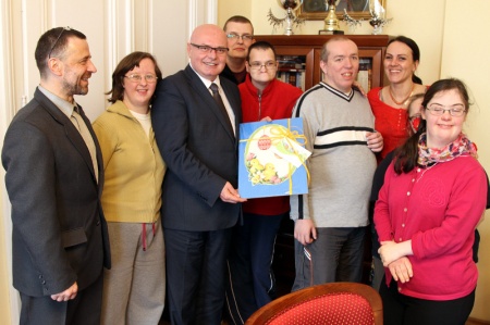Podopieczni Warsztatów Terapii Zajęciowej przy Fundacji "Mada" wraz z opiekunami złożyli prezydentowi Ryszardowi Nowakowi wielkanocne życzenia. Przekazali również świąteczny upominek. Każdy z uczestników spotkania w sądeckim ratuszu miał dla prezydenta swoje własne życzenia.