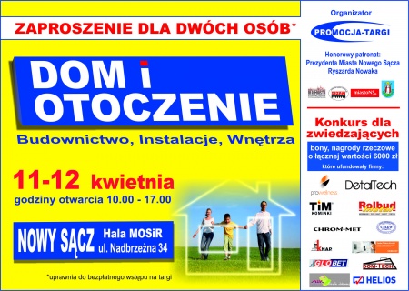 W dniach 11 i 12 kwietnia, pod patronatem prezydenta Ryszarda Nowaka, odbędą się Sądeckie Targi "Dom i Otoczenie". Hala sportowa MOSiR przy ul. Nadbrzeżnej zamieni się w miejsce, gdzie na kilkudziesięciu stoiskach, firmy z Nowego Sącza oraz innych rejonów Polski, zaprezentują aktualną ofertę: budownictwa, instalacji, wnętrz.