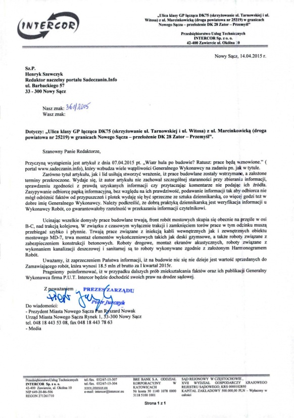 Prezes Zarządu Przedsiębiorstwa Usług Technicznych INTERCOR Sp. z o.o. Piotr Jurczyk, jako przedstawiciel głównego wykonawcy inwestycji Obwodnica Północna z nowym mostem na Dunajcu, jednoznacznie odniósł się do informacji opublikowanej na jednym z portali internetowych stwierdzając, że: - Autor artykułu nie zachował szczególnej staranności przy zbieraniu informacji, sprawdzaniu zgodności z prawdą uzyskanych informacji czy przytaczając komentarze nie podał ich źródła. Zasypywanie odbiorcy papką informacyjną, bez względu na ich prawdziwość, podawanie informacji tak aby odbiorca nie mógł odróżnić faktów od przypuszczeń i plotek, wydaje się sprzeczne ze sztuką dziennikarską (...).