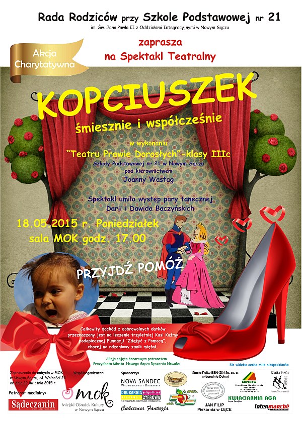 Rada Rodziców przy Szkole Podstawowej nr 21 im Św. Jana Pawła serdecznie zaprasza na spektakl teatralny „Kopciuszek-śmiesznie i współcześnie” w wykonaniu klasy III c. Spektakl zorganizowany jest w ramach akcji charytatywnej wspólnie z Fundacją „Zdążyć z Pomocą”. Uzyskany dochód zostanie przeznaczony na leczenie i rehabilitację trzyletniej Sądeczanki Kasi Kuźmy, chorej na rdzeniowy zanik mięśni.