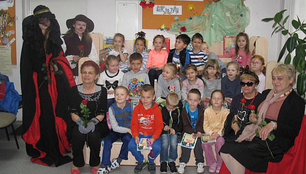 Dzieciaki wzięły udział w przedstawieniu teatralnym „Mucha i pająk” w wykonaniu pań: Zdzisławy Zaryczny i Ireny Abramowicz oraz wysłuchały kilku piosenek wykonanych przez kota w butach - pani Małgorzaty Kaczanowskiej.Całość przedstawienia uświetniła zła królowa z bajki o Królewnie Śnieżce - pani Gizela Kaczanowska.Zaczarowany świat bajek ukazał im piękno tkwiące w książkach i ich magicznych światach. Z pewnością też zachęci małych czytelników do kolejnej wizyty w bibliotece.