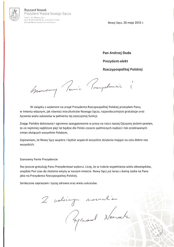 „Znając Pańskie dokonania i ogromne zaangażowanie w pracy na rzecz naszej Ojczyzny jestem pewien, że co najmniej najbliższe pięć lat będzie dla Polski czasem spełnionych nadziei i tak oczekiwanych zmian służących wszystkim Polakom. Zapewniam, że Nowy Sącz wspiera i będzie wspierał wszystkie działania mające na celu dobro nas wszystkich”- czytamy w przesłanym do Prezydenta- elekta Rzeczpospolitej Polskiej liście gratulacyjnym.