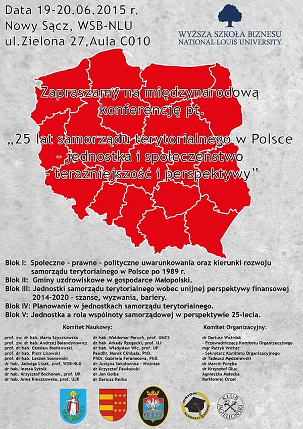 W dniach 19-20 czerwca 2015 r. w WSB-NLU odbędzie się konferencja poświęcona 25-leciu polskiego samorządu. Rozpoczęcie w piątek o godz. 9.30. w sali C126 Wyższej Szkoły Biznesu National Louis University przy ul. Zielonej 27.