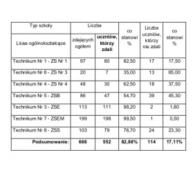 Na ogólną liczbę 1948 zdających, 1706 uczniów zdało egzamin, a 242 osoby matury nie zdało. W podziale na licea i technika nie zdało egzaminu maturalnego: 10% w liceach ogólnokształcących (128 osób) i 17% w technikach (114 uczniów).