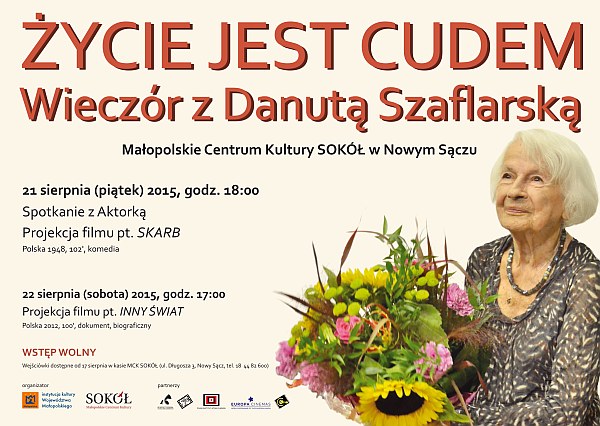 Zapraszamy na wyjątkowe spotkanie z wybitną polską aktorką, silnie związaną z Sądecczyzną - Danutą Szaflarską. Wydarzenie pn. "Życie jest cudem" odbędzie się 21 sierpnia 2015 o godz. 18.00 w Małopolskim Centrum Kultury SOKÓŁ.