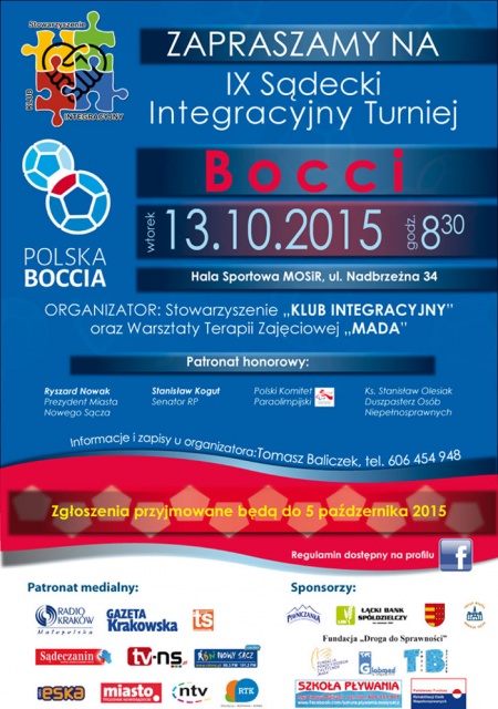 Serdecznie zapraszamy do udziału w IX Sądeckim Integracyjnym Turnieju Boccia, który zostanie tradycyjnie rozegrany na obiektach MOSIR w Nowym Sączu. Patronat nad wydarzeniem objęli: Ryszard Nowak - Prezydent Miasta Nowego Sącza, ks. Stanisław Olesiak SDB - Kapelan Osób Niepełnosprawnych oraz Polski Komitet Paraolimpijski.