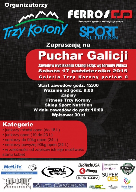 W sobotę 17 października w Galerii Trzy Korony odbędzie się I Puchar Galicji w konkurencji wyciskania sztangi leżąc. Główna nagroda to Puchar Prezydenta Miasta Nowego Sącza.