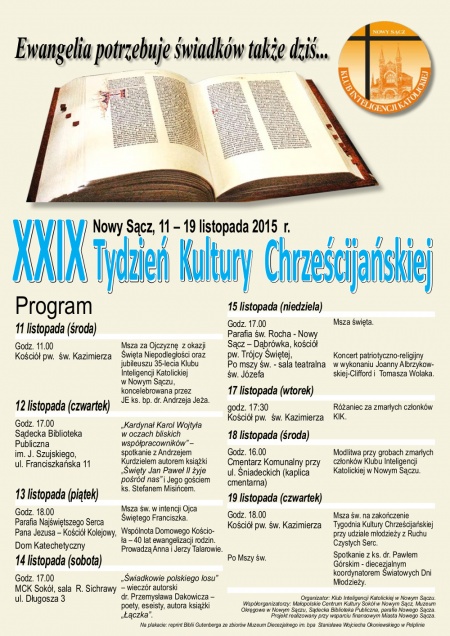 Pod hasłem "Ewangelia potrzebuje świadków także dziś", w dniach 11-19 listopada, w Nowym Sączu odbędzie się XXIX Tydzień Kultury Chrześcijańskiej. Organizatorem wydarzenia jest Klub Inteligencji Katolickiej. Współorganizatorami są: Małopolskie Centrum Kultury "Sokół", Muzeum Okręgowe w Nowym Sączu, Sądecka Biblioteka Publiczna, a także parafie z terenu miasta Nowego Sącza. Projekt zrealizowano przy wsparciu finansowym Miasta Nowego Sącza.