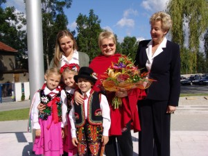 Minister Barbarę Labudę z Kancelarii Prezydenta RP powitały dzieci z przedszkola "Jaś i Małgosia" z panią dyrektor Zofią Smajdor