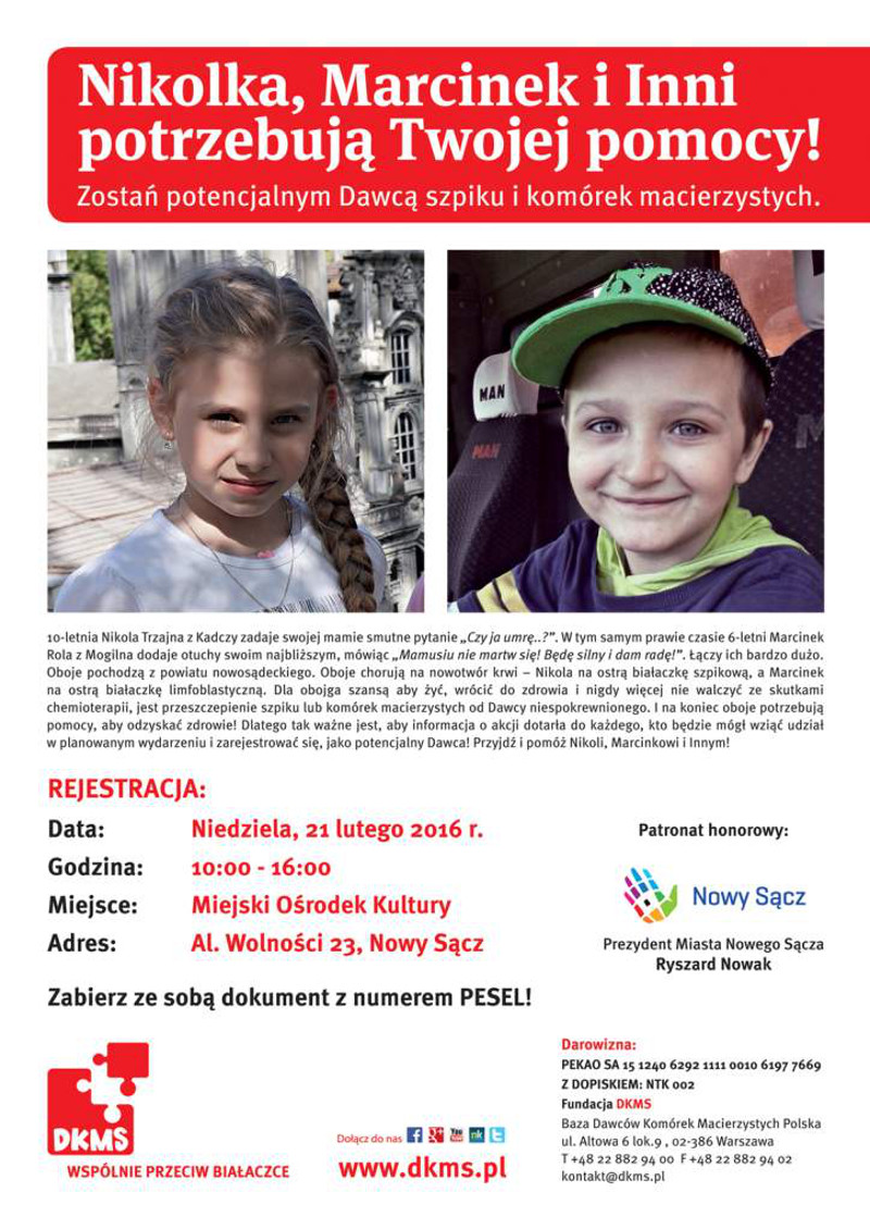 Pod patronatem Prezydenta Nowego Sącza Ryszarda Nowaka, 21lutego w Miejskim Ośrodku Kultury odbędzie się akcja rejestracji potencjalnych dawców szpiku kostnego dla dwójki chorych na białaczkę dzieci: 10-letniej Nikoli i 6-letniego Marcinka. Organizatorem wydarzenia jest Fundacja DKMS Polska z Warszawy przy wsparciu Urzędu Miasta Nowego Sącza i Miejskiego Ośrodka Kultury. Rejestracja połączona z akcją informacyjną odbędzie się w godzinach 10:00-16:00.