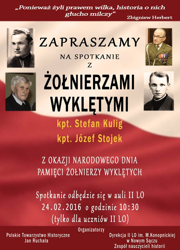 W dniu 24 lutego w auli II Liceum Ogólnokształcącego w Nowym Sączu o godz. 10:30 odbędzie się spotkanie dla uczniów szkoły z Żołnierzami Wyklętymi: kpt. Stefanem Kuligiem oraz kpt. Józefem Stojkiem. Wydarzenie nawiązuje do Narodowego Dnia Pamięci "Żołnierzy Wyklętych".