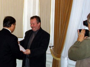 Na zdjęciu: Stanisław Kaim odbiera promesę z rąk wicewojewody małopolskiego Ryszarda Półtoraka.