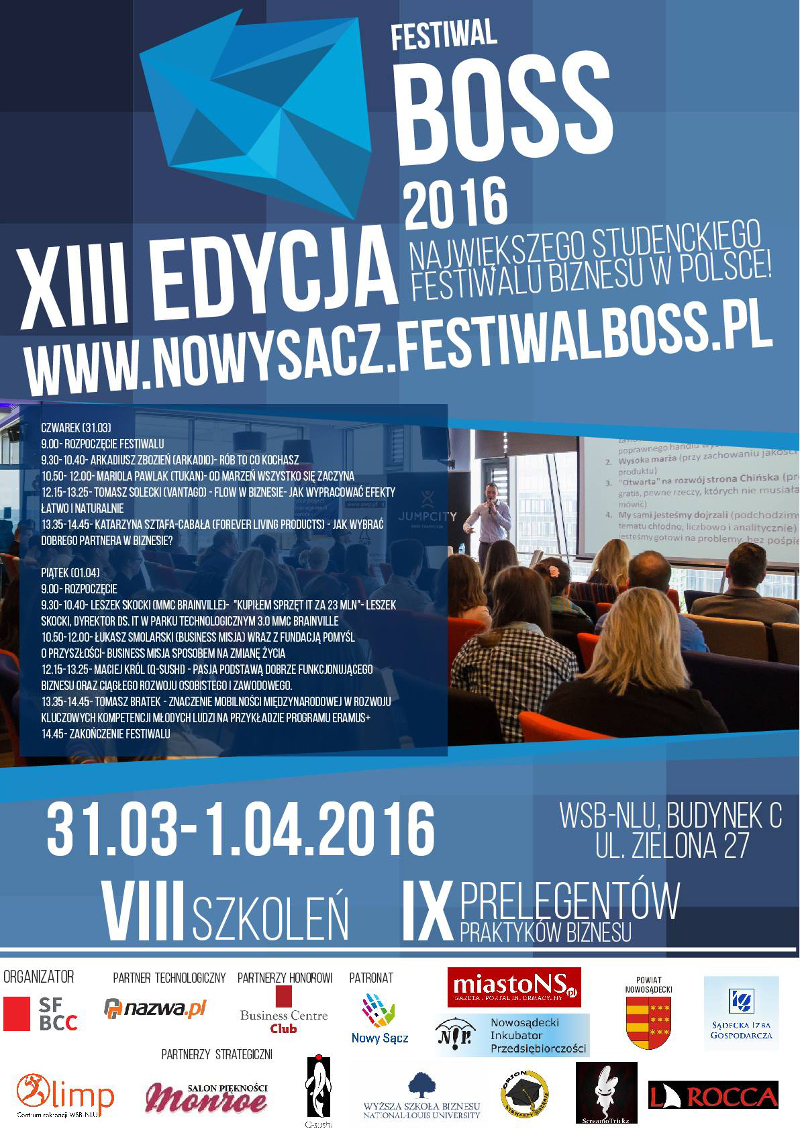 Pod honorowym patronatem Prezydenta Miasta Nowego Sącza Ryszarda Nowaka w dniach od 31 marca do 1 kwietnia odbędzie się XIII Festiwal Boss - Rozwój, Kariera, Sukces organizowany przez Fundację Studenckie Forum Business Centre Club. Festiwal BOSS jest największym wydarzeniem biznesowo-edukacyjnym w Polsce, odbywającym się nieprzerwanie od 13 lat w największych polskich miastach.