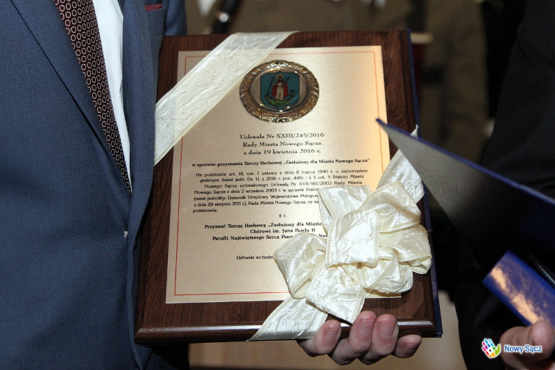 Wiceprzewodniczący Rady Miasta Nowego Sącza Michał Kądziołka wraz z radnymi Andrzejem Bodzionym i Józefem Gryźlakiem, przekazali na ręce Stanisława Wolaka przyznaną Chórowi Tarcze Herbową "Zasłużony dla Miasta Nowego Sącza". Michał Kądziołka odczytał również list gratulacyjny Przewodniczącej Rady Miasta Nowego Sącza Bożeny Jawor. Czytamy w nim m.in.: "Śpiew jest głosem kościoła, niezbędną częścią jego uroczystości, czyni piękną nawet pustynię, daje zajęcie aniołom, jest duchową ozdobą niebiańskiej republiki. Cóż można jeszcze dodać do tych słów św. Bazylego Wielkiego? Jesteście muzyczną wizytówką nie tylko naszej parafialnej rodziny Najświętszego Serca Pana Jezusa, ale także wizytówka naszego miasta".