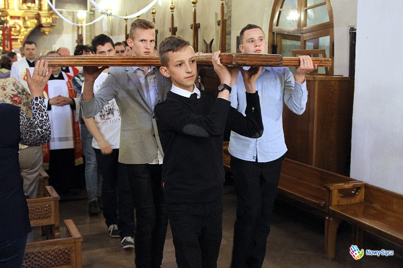 Tym razem znaki oddaliły się na południe naszego okręgu do parafii pw Nawiedzenia NMP w Nawojowej. Również w tym miejscu czekała na nie młodzież z miejscowych oraz nowosądeckich szkół. Podczas półtora godzinnego czuwania utworzyła się długa kolejka ludzi, którzy w postawie klęczącej zbliżali się do Krzyża i Ikony, aby przez chwilę być blisko symboli, modlić się pod nimi oraz zawierzyć swoje sprawy. Młodzi po raz kolejny dali piękne świadectwo swojego przywiązania oraz szacunku do Krzyża i Matki Bożej.