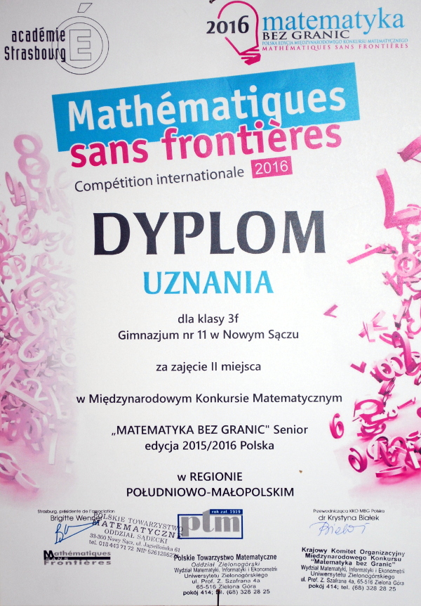 Uczniowie klasy 3f z Gimnazjum nr 11 im. Adama Mickiewicza w Nowym Sączu, pod kierunkiem nauczyciela matematyki Jolanty Bodziony, zdobyli II miejsce w XXVII edycji Międzynarodowego Konkursu "Matematyka bez granic" w regionie południowo-małopolskim, któru jest organizowany pod auspicjami Rady Europy. Warto podkreślić, że uczniowie "Jedenastki" stracili do zwycięzców konkursu tylko 2 pkt.