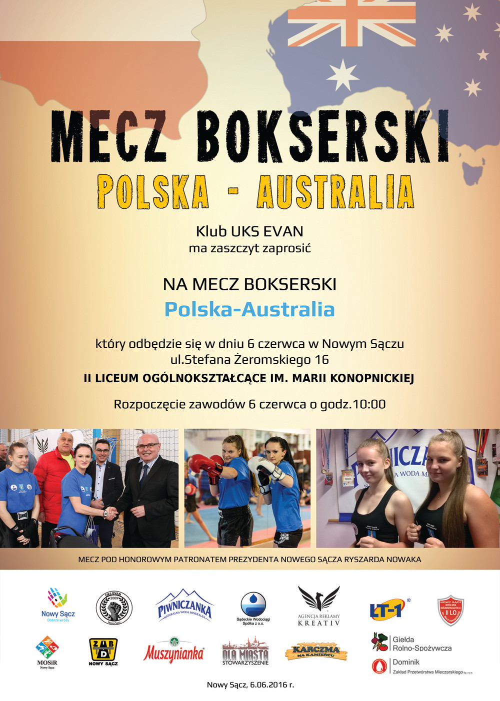 Pod honorowym patronatem Prezydenta Miasta Nowego Sącza Ryszarda Nowaka odbędzie się mecz bokserski Polska-Australia. Zawody rozpoczną się o godz. 10:00 w II Liceum Ogólnokształcącym im. Marii Konopnickiej w Nowym Sączu. Organizatorem zawodów jest Uczniowski Klub Sportowy Evan.