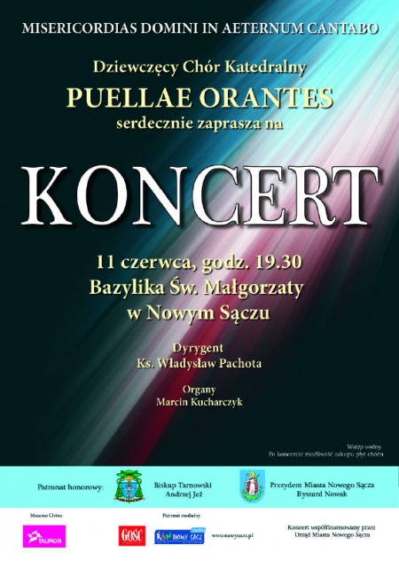 Dziewczęcy Chór Katedralny "Puellae Orantes" serdecznie zaprasza na koncert, który odbędzie się 11 czerwca, o godz. 19:30 w Bazylice Św. Małgorzaty w Nowym Sączu. Powyższe wydarzenie artystyczne jest częścią realizowanego przez chór cyklu koncertów z okazji Jubileuszu Miłosierdzia Bożego oraz 1050. rocznicy Chrztu Polski.