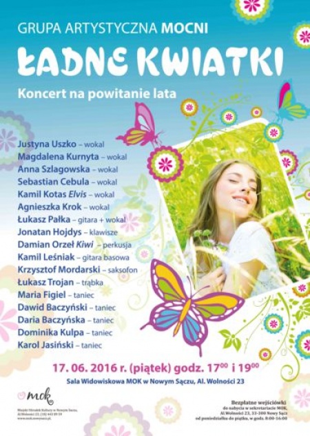 W dniu 17 czerwca (piątek) o godz. 17:00 i 19:00 w Sali Widowiskowej Miejskim Ośrodku Kultury w Nowym Sączu - Al. Wolności 23 - odbędą się dwa koncerty na powitanie lata pt. "ŁADNE KWIATKI" z udziałem Grupy Artystycznej MOCNI oraz zaproszonych przez nią wokalistów, muzyków i tancerzy z innych, działających pod patronatem MOK, zespołów.