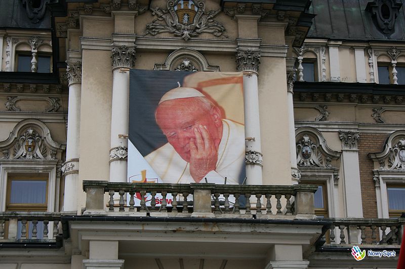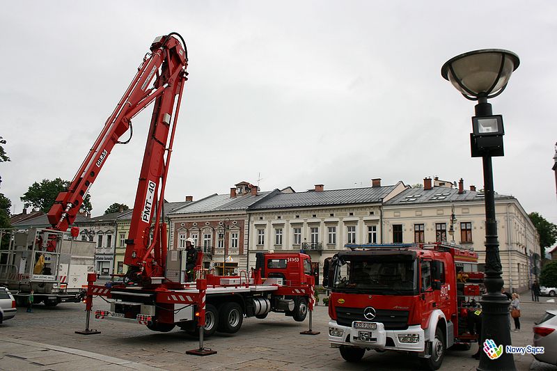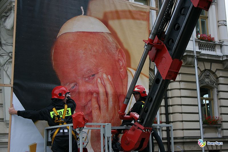 Trwają ostatnie przygotowania do Tygodnia Misyjnego w Nowym Sączu. Dzisiaj na sądeckim Rynku strażacy z Komendy Miejskiej Straży Pożarnej umieścili na wieży ratuszowej wizerunek św. Jana Pawła II, który będzie towarzyszył polskiej i francuskiej młodzieży przez cały okres trwania Światowych Dni Młodzieży w Krakowie.