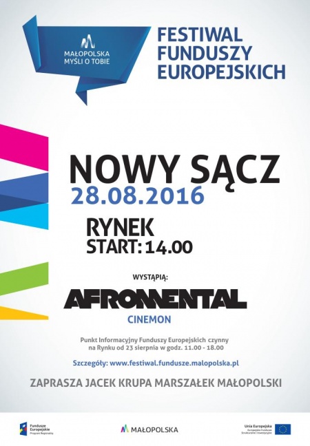 Festiwal Funduszy Europejskich odbywa się w sześciu miastach naszego regionu. Impreza w Nowym Sączu kończy tegoroczny cykl Festiwalu. Organizatorem imprezy jest Urząd Marszałkowski Województwa Małopolskiego.