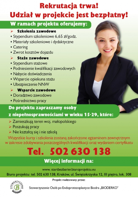 Rekrutacja trwa, ale liczba miejsc jest ograniczona. Wszelkie informacje można uzyskać pod numerem telefonu 502 630 138 i na stronie www.startbezbarier.biuroprojektu.eu. Biuro projektu znajduje się w Krakowie przy ul. Świętokrzyskiej 12, III p., pok. 308.