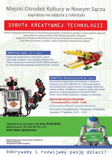 Miejski Ośrodek Kultury w Nowym Sączu zaprasza na cykl pt. „Sobota Kreatywnej Technologii”. Pod tym tajemniczym hasłem kryją się zajęcia z robotyki dla dzieci i młodzieży, które rozwijają wyobraźnię przestrzenną, kreatywność i zdolności manualne.