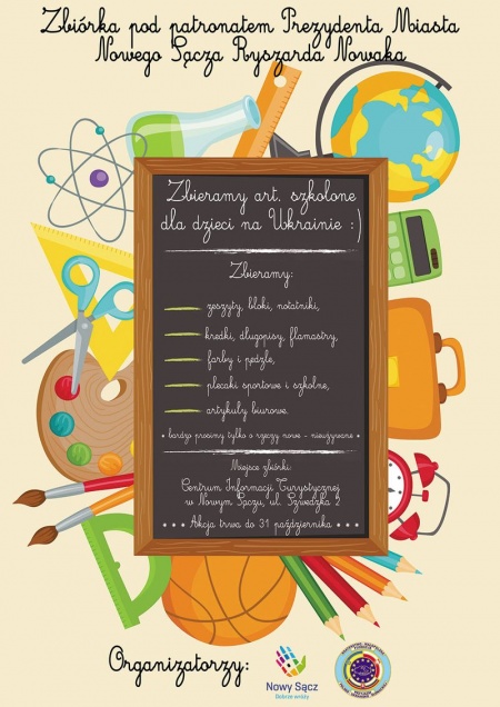 Po sukcesie akcji zbierania książek dla Polaków na Ukrainie, przyszła pora na kolejną wspólną akcję charytatywną organizowaną przez Urząd Miasta Nowego Sącza i Małopolską Fundację Przyjaźni Polsko – Ukraińsko – Słowackiej "Braterstwo" z Krynicy – Zdroju. Tym razem zbieramy szeroko pojęte artykuły szkolne i biurowe, które trafią do dzieci na Ukrainie.