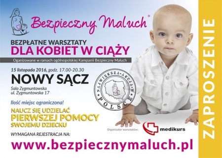Wstęp na spotkania jest bezpłatny, ale liczba miejsc ograniczona! Najbliższe warsztaty w Nowym Sączu odbędą się 15 listopada 2016 w Sali Zygmuntowskiej przy ul. Zygmuntowskiej 17 w godzinach 17.00-20.30. Przyszli rodzice, którzy chcą zdobyć wiedzę przekazywaną przez doświadczonych instruktorów powinni zarejestrować się poprzez stronę internetową: www.bezpiecznymaluch.pl.
