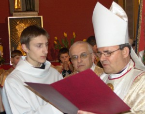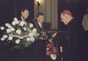 Ks. biskup Józef Gucwa odbiera tytuł Honorowego Obywatela Miasta Nowego Sącza w styczniu 1999 roku z rąk ówczesnego prezydenta Andrzeja Czerwińskiego i przewodniczącego Rady Miasta Jerzego Wituszyńskiego.