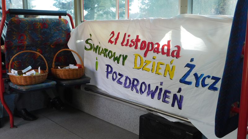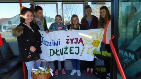 W tym roku uczniowie postanowili podzielić się życzliwością i uśmiechem z mieszkańcami Nowego Sącza jeżdżąc z nimi autobusem linii 23. Częstowali jabłkami i cukierkami. Spotkali się z dużą sympatią. Pasażerowie dopytywali o szczegóły Święta, dzielili się swoimi historiami, byli bardzo mili i serdeczni.