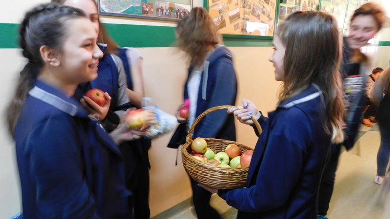 Kolejną odsłoną Święta był happening na terenie Gimnazjum. Uczniowie i nauczyciele również częstowali się jabłkami i cukierkami wymieniając się życzeniami. Wyświetlany był pokaz slajdów.
