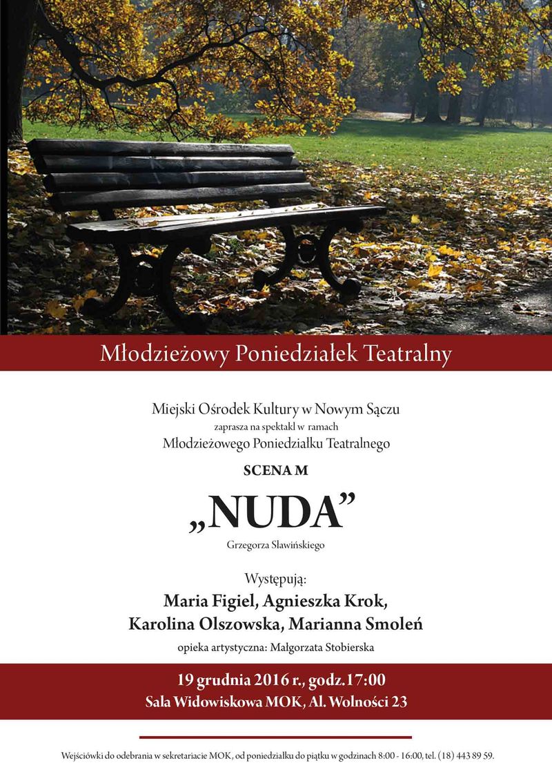 "Nuda" Grzegorza Sławińskiego w wykonaniu aktorek Sceny M: Marii Figiel, Agnieszki Krok, Karoliny Olszowskiej i Marianny Smoleń to kolejna propozycja w ramach Młodzieżowych Poniedziałków Teatralnych. Przedstawienie odbędzie się 19 grudnia (poniedziałek) w Miejskim Ośrodku Kultury w Nowym Sączu.