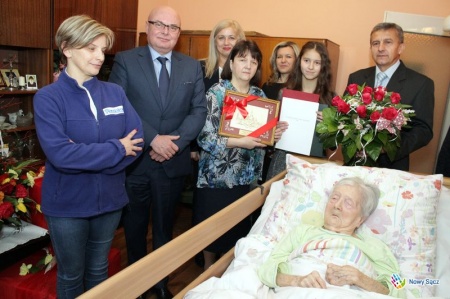 Życzenia zdrowia i wszelkiej pomyślności, a także listy gratulacyjne od Prezesa Rady Ministrów oraz Wojewody Małopolskiego, obchodzącej setne urodziny Leokadii Bąk przekazał prezydent Nowego Sącza Ryszard Nowak. Podczas wizyty u Jubilatki najlepsze życzenia złożyli również wicedyrektor nowosądeckiego oddziału Zakładu Ubezpieczeń Społecznych Agata Michalik oraz kierownik Urzędu Stanu Cywilnego Małgorzata Antkiewicz-Wójs.
