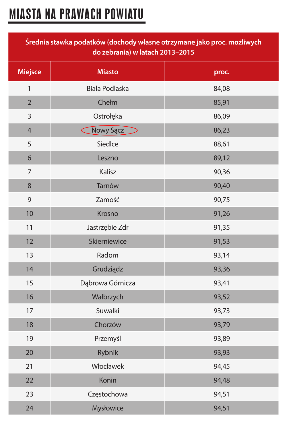 Pismo Wspólnota opublikowało na swoim portalu najnowszy raport pn. „Polityka podatkowa gmin 2013-2015”, przygotowany przez prof. Pawła Swianiewicza oraz dr Julitę Łukomską. Wśród miast na prawach powiatu Nowy Sącz zajął wysokie 4. miejsce, co oznacza, że w swojej kategorii nasze miasto w czołówce najmniej fiskalnych miast w Polsce.