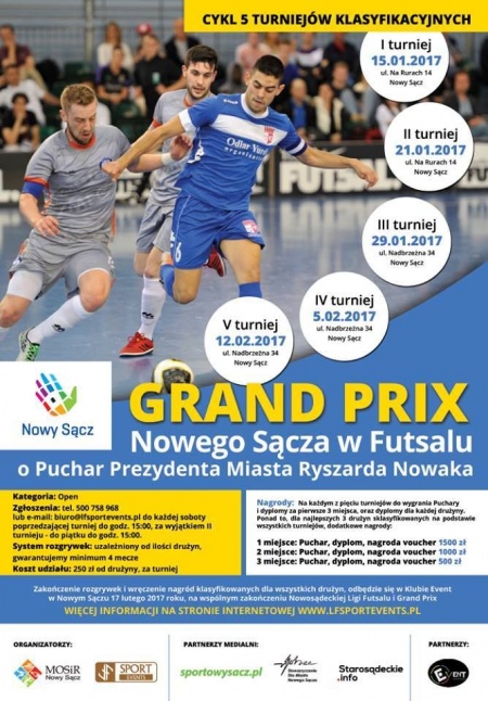 Podczas pierwszego turnieju (15 stycznia) wolontariusze zbierać będą datki na Wielką Orkiestrę Świątecznej Pomocy. Kolejne turnieje zaplanowano 21 i 29 stycznia oraz 5 i 12 lutego bieżącego roku. Wspólne zakończenie Grand Prix o puchar prezydenta Ryszarda Nowaka i Nowosądeckiej Ligi Futsalu zaplanowano na 17 lutego bieżącego roku roku w Klubie Event w Nowym Sączu.
