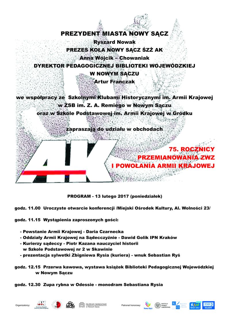 W poniedziałek 13 lutego przypada 75. rocznica przemianowania Związku Walki Zbrojnej i powołania Armii Krajowej. Z tej okazji w Miejskim Ośrodku Kultury odbędzie się konferencja poświęcona temu wydarzeniu. Wśród zapraszających na spotkanie jest prezydent Nowego Sącza Ryszard Nowak.