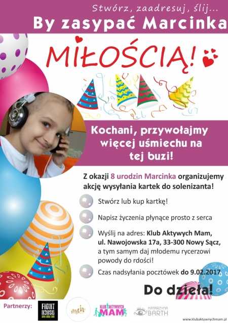 Organizujemy szybką akcję *"By zasypać Marcinka miłością"*, w której prosimy Was o stworzenie własnej bądź kupienie gotowej kartki z życzeniami dedykowanymi specjalnie dla niego. Chcemy by w tej nierównej walce jaka ten dzielny rycerz toczy choć w ten jedne dzień niech będzie wygrany na maxa!