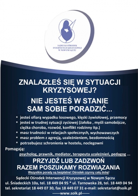 Z usług Ośrodka mogą skorzystać osoby dotknięte przemocą i jej skutkami. Pomoc udzielana jest bezpłatnie. Osoby zainteresowane prosimy o kontakt bezpośredni lub telefoniczny. Nasz adres: ul. Śniadeckich 10a, tel. 18 449 04 95 oraz ul. Tarnowska 28, tel. 18 449 04 94 od poniedziałku do piątku w godz. 7:00 – 16:00 . Więcej informacji na naszej stronie internetowej www.soik.pl. /Źródło: SOIK/