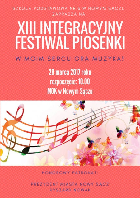 Pod patronatem Prezydenta Miasta Nowego Sącza Ryszarda Nowaka w dniu 28 marca w Miejskim Ośrodku Kultury odbędzie się XIII Integracyjny Festiwal Piosenki "W moim sercu gra muzyka". Rozpoczęcie o godzinie 10:00. Na wydarzenie zaprasza organizator festiwalu - Szkoła Podstawowa nr 6 w Nowym Sączu.