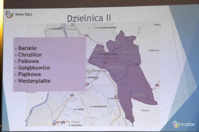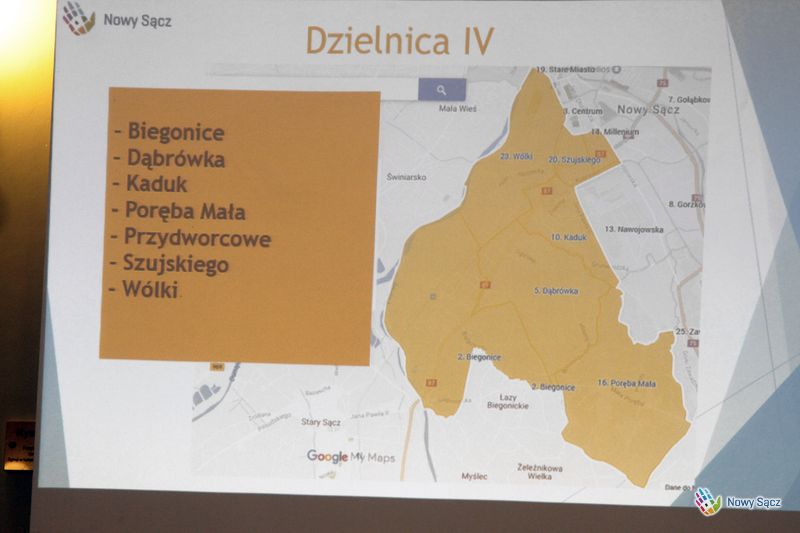 Pozostałe cztery części BO, także w wysokości do 400 tys. złotych każda, zostaną przeznaczone na zadania dzielnicowe, zarówno o charakterze "twardym" (a więc np. budowa lub modernizacja infrastruktury) jak i "miękkim". Obszar Nowego Sącza proponuje się podzielić na cztery dzielnice w skład każdej wchodziłoby 6-7 osiedli. Dzielnice mają zbliżoną liczbę mieszkańców i pokrywają się z okręgami wyborczymi w wyborach samorządowych.