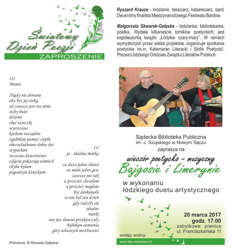 "Bajgosie i Limerynie". Pod takim hasłem w najbliższy poniedziałek (20 marca) odbędzie się wieczór poetycko - muzyczny w Sądeckiej Bibliotece Publicznej im. Józefa Szujskiego. Wieczór przygotowano z okazji Światowego Dnia Poezji, który obchodzony jest pierwszego dnia wiosny.