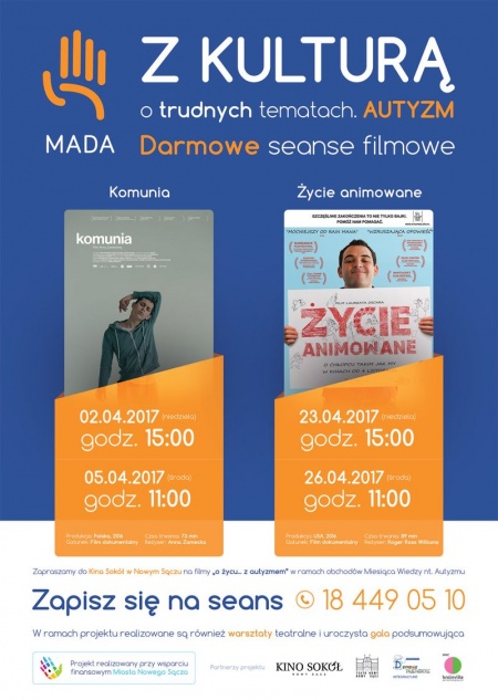 W ramach projektu we współpracy z kinem Sokół w Nowym Sączu będzie można zobaczyć dwa wyjątkowe filmy dokumentalne o życiu z autyzmem - "Komunia" (Polska 2016) oraz "Życie animowane" (USA 2016). Są to niezwykłe, poruszające historie opowiedziane przez osoby z autyzmem, dające widzom możliwość towarzyszyć przez chwilę w ich zadziwiającej codzienności.