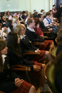 Zanim przystąpiono do debaty pod hasłem „Żyć i uczyć się w demokracji” oficjalnie doszło do przekazania insygniów władzy: złoty łańcuch przewodniczącego dorosłej Rady Miasta Jacek Chronowski przekazał przewodniczącej „gimnazjalnego parlamentu” Agnieszce Krawczuk z klasy 3 H z Gimnazjum nr 2.