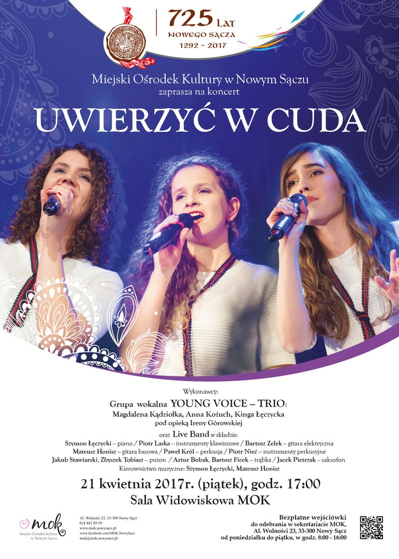 "Uwierzyć w cuda" – taki tytuł nosi koncert w wykonaniu Grupy Wokalnej YOUNG VOICE - TRIO (21 kwietnia, piątek). Śpiewają w niej Magdalena Kądziołka, Anna Kożuch i Kinga Łęczycka, a opiekę artystyczną sprawuje Irena Górowska. Wokalistkom towarzyszyć będzie zespół Live Band pod kierownictwem Szymona Łęczyckiego i Mateusza Honisza. Koncert rozpocznie się o 17:00 w sali widowiskowej MOK. Bezpłatne wejściówki do odebrania w sekretariacie MOK w dni robocze w godz. 8:00-16:00.