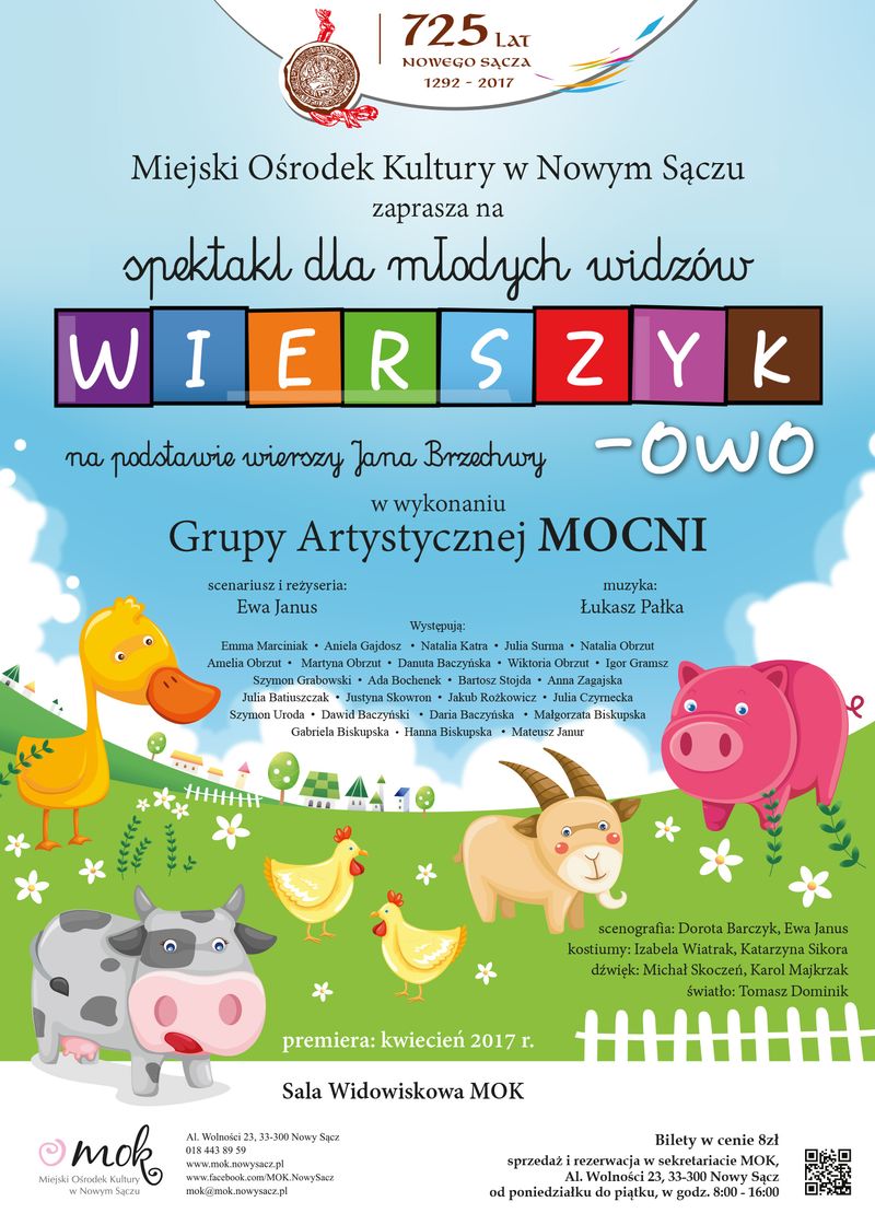 W kwietniu będzie miała miejsce premiera spektaklu dla młodych widzów "Wierszyk-owo" na podstawie wierszy Jana Brzechwy. Przedstawienie przygotowała Grupa Artystyczna MOCNI według scenariusza i w reżyserii Ewy Janus. Bilety w cenie 8 zł można rezerwować w sekretariacie MOK w dni robocze w godz. 8:00-16:00. Zapraszamy! /Źródło: MOK Nowy Sącz/