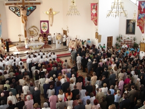 Ksiądz biskup głosił wiernym: „Pamiętajcie, iż ta świątynia, w której mieszka Bóg utwierdzać was musi w przekonaniu, że jesteście jedną wielką rodziną. Cieszy, że tak chętnie identyfikujecie się z kościołem, który przecież pracą rąk własnych wznieśliście”.