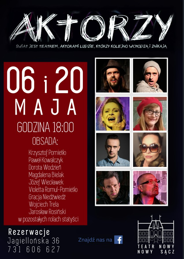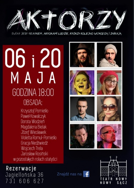 Spektakl "Aktorzy" wyreżyserował Krzysztof Pomietło, a w rolę aktorów wcielą się... aktorzy: Józef Więcławek, Gracja Niedźwiedź (lub Wioletta Romul – Pomietło), Paweł Kowalczyk, Dorota Wodzień i inni. "Aktorzy" w Teatrze Nowym przy ul. Jagiellońskiej 36 w najbliższy czwartek (20 maja) o godz. 18:00. Rezerwacja biletów pod numerem 731 606 627. Zapraszamy! /Źródło i fot. Teatr Nowy/