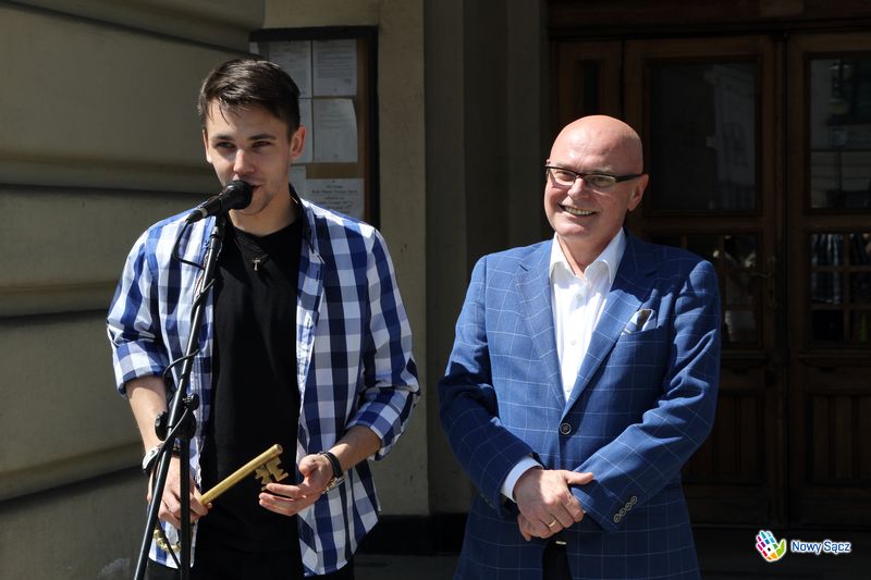 - Przekazuję wam ten klucz z pełnym zaufaniem, że przez te kilka dni będziecie doskonałymi włodarzami, przynajmniej na tyle, żeby dobrze zabawić sądeczan i pokazać, że miasto Nowy Sącz, to także miasto studentów - mówił do sądeckich żaków prezydent Ryszard Nowak, a klucz do bram miasta przekazał na ręce Marka Uszko, przewodniczącego Uczelnianej Rady Samorządu Studentów PWSZ.